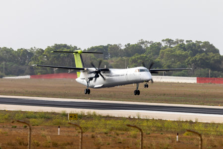 Borispol, Ukraine - October 2, 2011: Air Baltic DHC-8 regional plane just after taking off into the blue sky