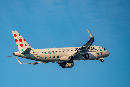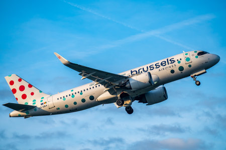 Brussels, Belgium - Dec 21, 2025: Brussels Airlines Airbus A320neo passenger jet taking off from Brussels Airport against clear blue sky.