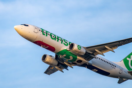 Brussels, Belgium - January 17, 2026: Transavia Boeing 737-800 flying overhead shortly after takeoff from Brussels Airport (Zaventem) against clear blue sky.