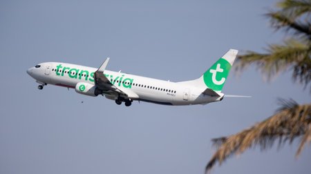 SPAIN, BARCELONA - AUGUST 18, 2023: Transavia Boeing 737-700 airplane takes off from Barcelona