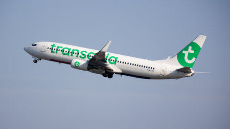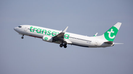 Barcelona, Spain - August 18, 2023: Modern comfortable business jet of Transavia Airlines takes off from El Prat Airport