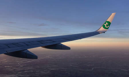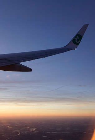 Amsterdam, Holland - Oct 8, 2018. Wing of Transavia Boeing 737-800 in sunrise. Transavia is a Dutch low-cost airline and a wholly owned subsidiary of KLM.