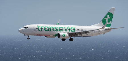Tenerife, Spain august 2st, 2023. Boeing 737 of Transavia Airlines flies in the blue sky over the ocean