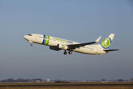 The Transavia Boeing 737-8K2 with identification PH-HSC takes off at Amsterdam Airport Schiphol (The Netherlands, AMS), Polderbaan on March 13, 2016.