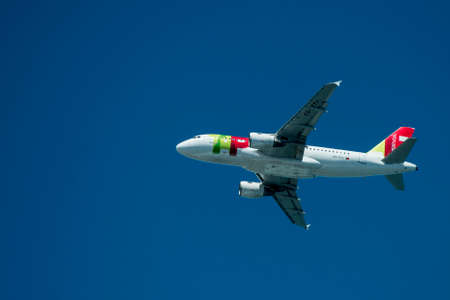 Portugal, Lisbon, October 09, 2018: Airplane of TAP PORTUGAL in blue sky.