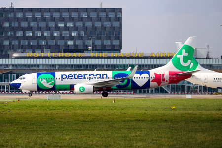 Transavia plane with Peter Pan flying club advertisement at Rotterdam The Hague Airport. The Peter Pan flying club organizes trips for young people who cannot 'just' go on holiday due to illness or difficult circumstances.