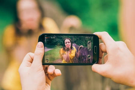 Young man makes photo of girl friend. Close up of male hands holding cellphone. Shallow depth of field. Focus on image in phone.