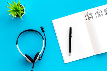 Desk of musician for songwriter work with headphones and notes on blue background top view