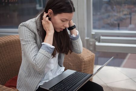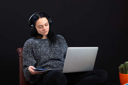 focused young student woman sitting with laptop and headphones, learning remotely online from home