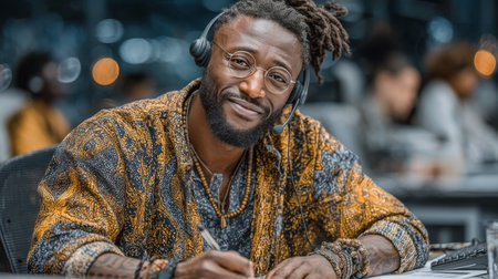 Cheerful black agent wearing headset writing at a desk in a busy modern office setting.