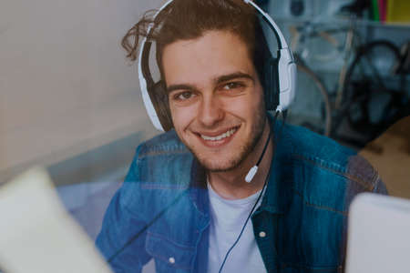 Man using VOIP headset with latop computer on desk in modern office as call center and customer service help desk concept
