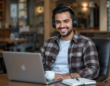 A happy man works on his laptop in a cozy cafe, wearing headphones. Warm lighting and a relaxed atmosphere.
