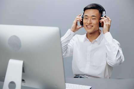 Confused or angry businessman or student in a shirt sitting against monitor of computer in headphones and speaking with somebody via internet. Working on a pc at a table in the office.