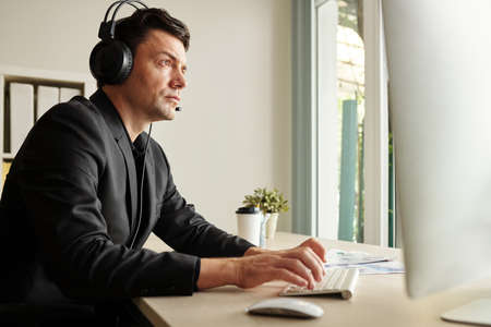 Businessman with headset as a customer service representative writes on PC keyboard in the office