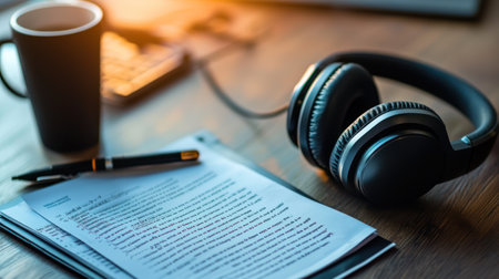 A Recording setup with headphones, script, and coffee cup for podcasting