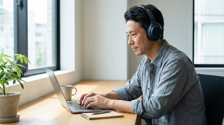 The image depicts a person sitting at a desk, working on a laptop. The individual is wearing headphones and appears to be focused on the laptop screen. The scene suggests a workspace environment, possibly for study or work.