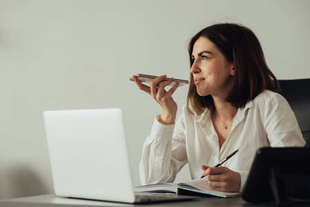 Cheerful Young Woman Working at Office, Female Employee Using Smartphone Voice Message While Sitting by the Laptop at Workplace