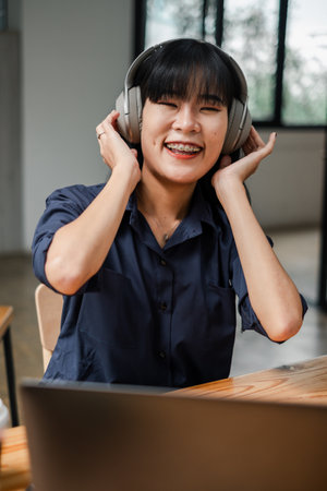 A woman wearing headphones and smiling. She is wearing braces and is sitting at a desk. Concept of happiness and relaxation as the woman enjoys her music