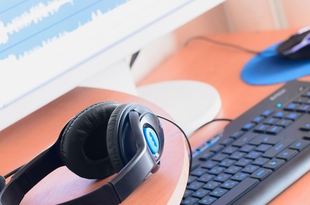 Big black headphones lie on the wooden desktop of the sound designer. Workplace for music creator. Selective focus