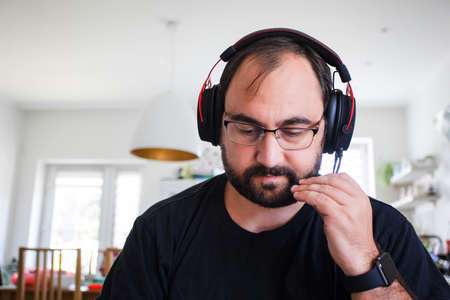 Young man makes a podcast audio recording at home. Man using pc and two professional microphones. Person recording a podcast at home using microphone and computers. Recording online podcast