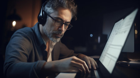 AI startup office chief technology officer listening music while building application. Senior developer wearing headphones while working in artificial intelligence software development agency