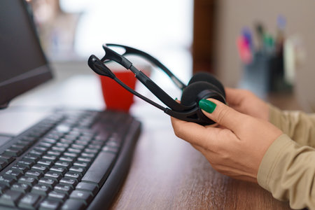 Close-up view of caucasian woman hands holding microphone headset. Call center, office, remote or work from home concept.