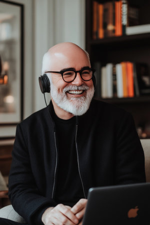 Smiling Senior Man Enjoys Online Learning, Working From Home Office With Laptop And Headphones.