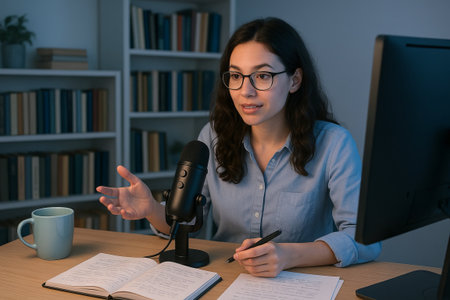 Brunette woman hosting educational stream from home office with microphone and laptop in cozy evening ambience. concept of virtual learning, educational content creation, digital communication.