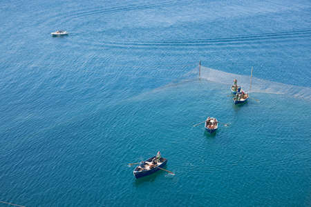 Fishermen on boats in the azure sea check the network, view from above, a big catch