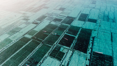 Croatia oyster farms - aerial view of shellfish farming near Mali Ston bay (Peljesac Peninsula).