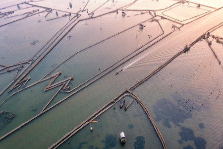 Aerial view of aquaculture nets for fish farm in a lake in Sri Racha, Chonburi, Thailand. tropical beach, Andaman sea, bay island. Top view.