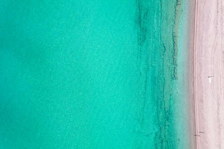 Top view from sky of sea wave and sand beach landscape with outdoor sun lighting.