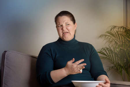 Woman touching her fat belly. Conceptual of overweight or diet background.