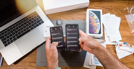 Paris, France - Sep 21, 2018: Apple fan boy unboxing latest new Apple Iphone Xs Max and Xs flagship smartphone mobile manufactured by Apple Computers using stocks app watching trend of AAPL quotation