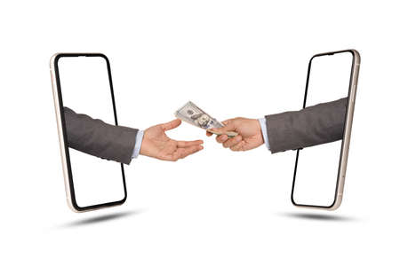 One Businessman holding dollar banknote to give and one businessman receives it thru smartphone on white background, money transfer and electronic payment concept.