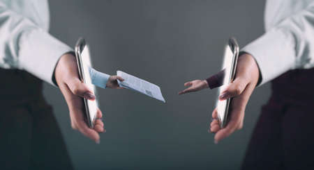 One arm reaching out resume out of smart phone to another arm coming from another smart phone