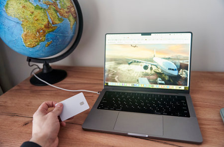 Kaliningrad, Russia - 08.02.2024: Person holds credit card in front of computer for online transaction