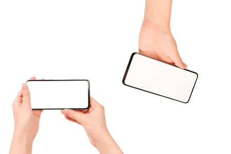 Smart phone in woman hands isolated on white background. White screen. Copy space.