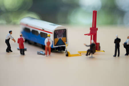 Miniature people: Workers fixing train. Maintenance concept.