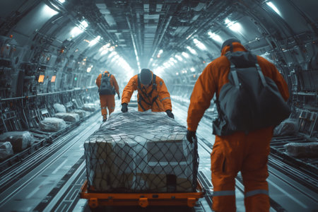 Airport workers wearing orange overalls pushing a cargo trolley inside the hold of an airplane