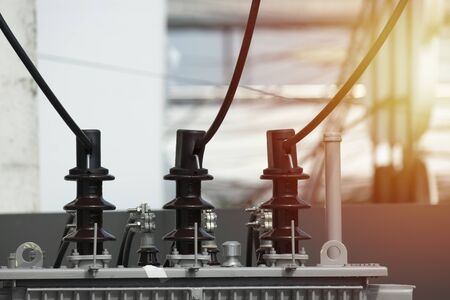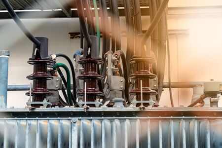 High voltage power transformer. Electricity distribution station. Electrical power equipment.