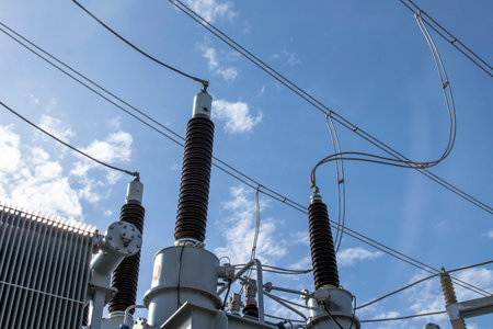Industrial landscape with high-voltage substation and blue sky