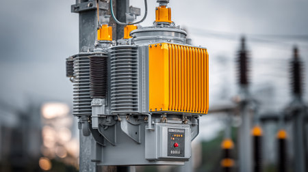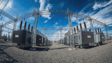 Captivating image of a modern industrial power station showcasing high voltage equipment under a cloudy sky, emphasizing energy infrastructure and urban technology.