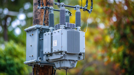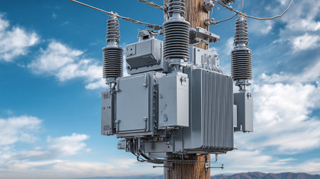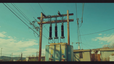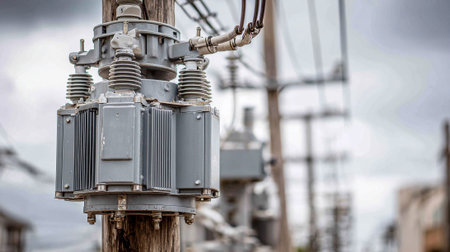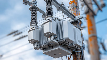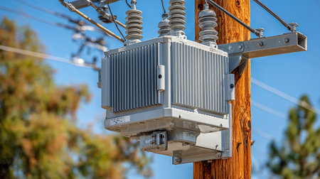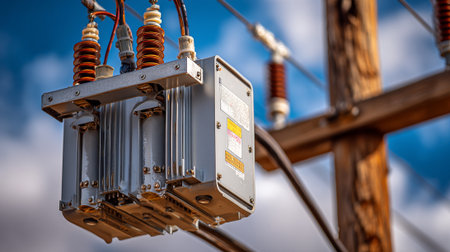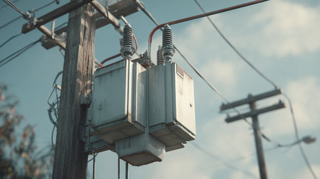 An electric transformer mounted on a power pole, showcasing essential infrastructure for electricity distribution and connectivity in urban and rural settings.