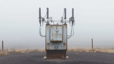 A solitary industrial transformer stands in a foggy landscape, surrounded by wires and poles, representing the challenges of energy supply and infrastructure.