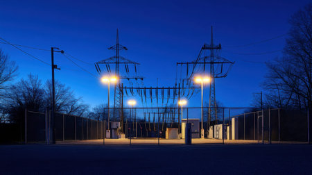 A power substation illuminated at dusk, showcasing its industrial architecture against a clear blue sky, representing modern energy infrastructure.
