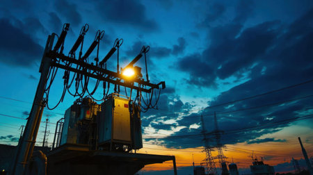 An image showcases a power plant featuring tall metal structures and overhead wires against a cloudy evening sky. The composition emphasizes the industrial nature, with dark hues, creating a sense of scale and providing a visual of energy. Suitable for various uses within the energy and infrastructure sectors.