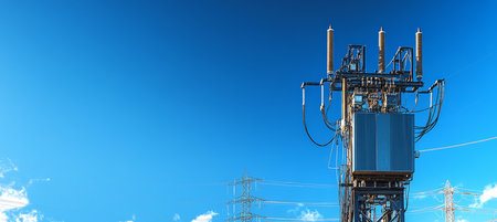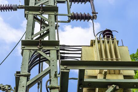 Power transformer on a high-voltage tower against the blue sky