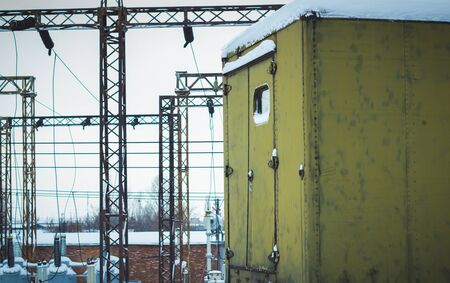 High voltage electric power substation in winter day