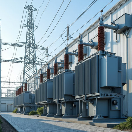 High-voltage electrical equipment and transformers at an outdoor substation